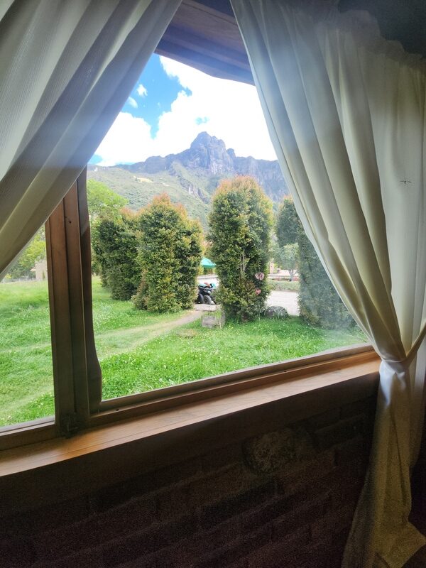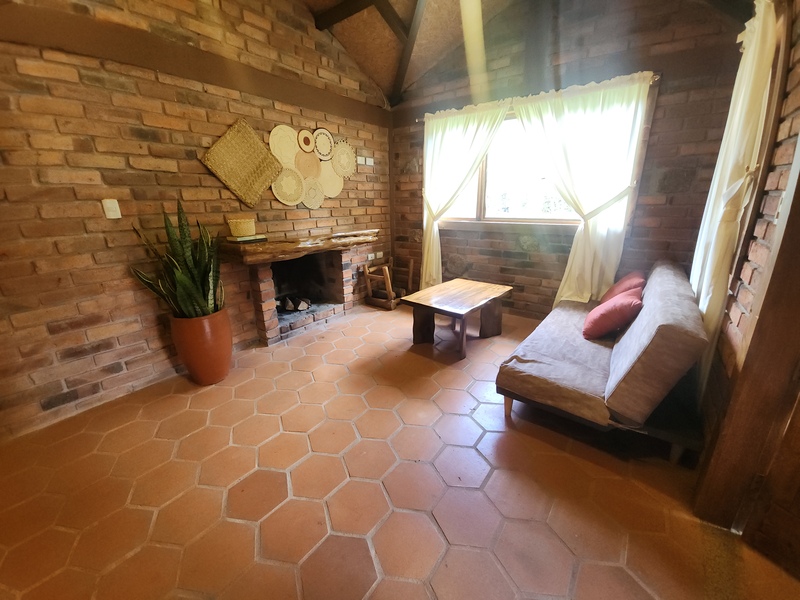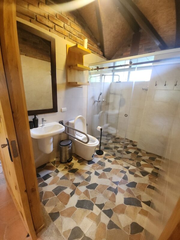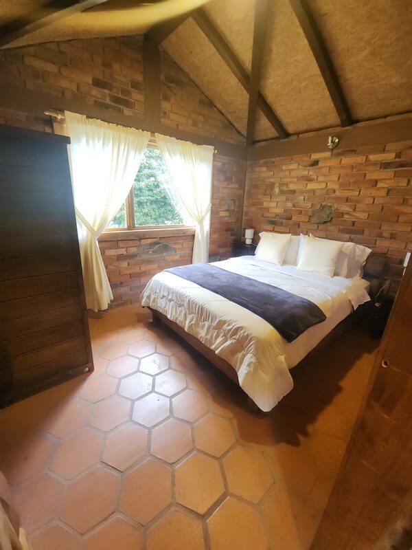 Cabaña Nuna: Cabaña rústica independiente diseñada para personas con discapacidad, con dos habitaciones (una con cama doble y otra con cama individual), sala de estar, estación de té e infusiones, baño privado con ducha de agua caliente, chimenea y vistas directas a los jardines y espacios verdes.
